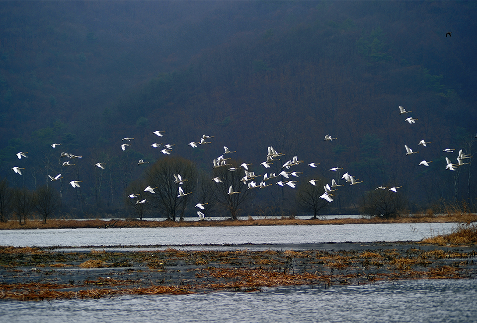 짙은 물안개 사이로 유유히 떠다니는 백조들의 모습은 마치 한 폭의 수묵화처럼 평화롭고 고요하다.