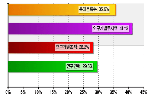 | 연구개발투자비 (백만원, %) | 연구개발조직수 (개소, %) | 연구개발인력수(명, %) | 특허 등록수(건수, %) |
